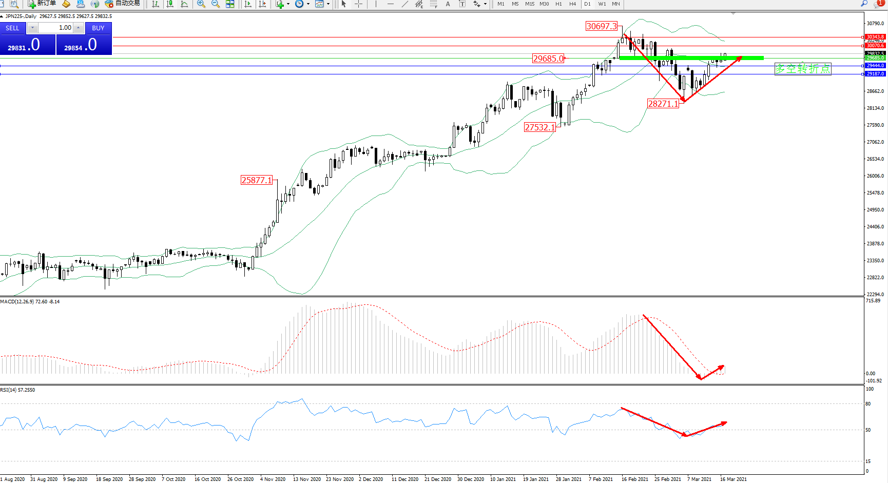 技术点评:高位空头动力短暂震荡回撤后,抵达28271附近节点得到支撑开始反转上移,纠结于布林带指标中上轨区间持续震荡中,多头动力有继续向上移动态势,布林带指标呈收口走势持续中,MACD指标处于0轴线附近弱势震荡有上移迹象,RSI指标处于50均衡线上方弱势徘徊上移中;