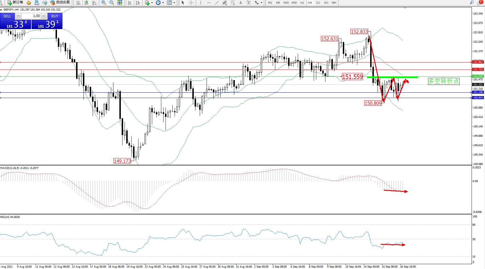 技术点评:空头动力急速震荡下行后,低位抵达150.809位置得到支撑,开始维持在布林带指标通道中下轨区间窄幅整理平移,短期或维持弱势徘徊,布林带指标呈收口走势有继续向下移动迹象,MACD指标处于0轴下方空头区域维持整理平移,RSI不足处于50均衡线下方空头区域维持弱势徘徊中;
