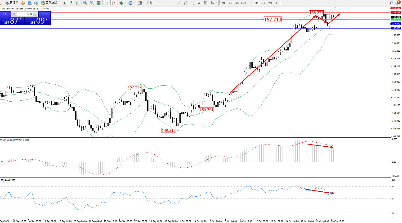 技术点评:多头动力延续布林带指标通道中上轨区间持续震荡上扬,高位抵达158.237附近节点后开始维护高位整理,短期多头动力依旧有上扬迹象,布林带指标呈收口走势后有张口迹象,MACD指标处于多头区域维持整理,RSI指标处于多头区域维持震荡下行;