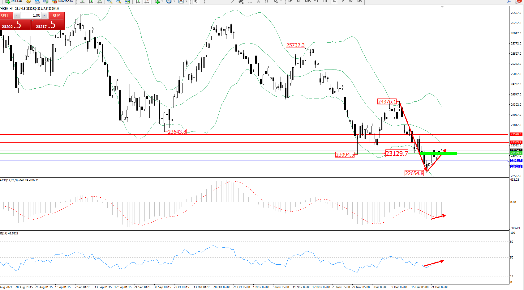 技术点评:空头动力延续布林带指标下轨附近持续震荡下行,低位抵达22654位置得到支撑开始震荡上移,即将触及布林带指标中轨附近节点,布林带指标呈收口走势中,低位多头动力开始缓慢向上移动,MACD指标处于空头区域维持整理向上移动,RSI指标处于空头区域呈上行走势中;
