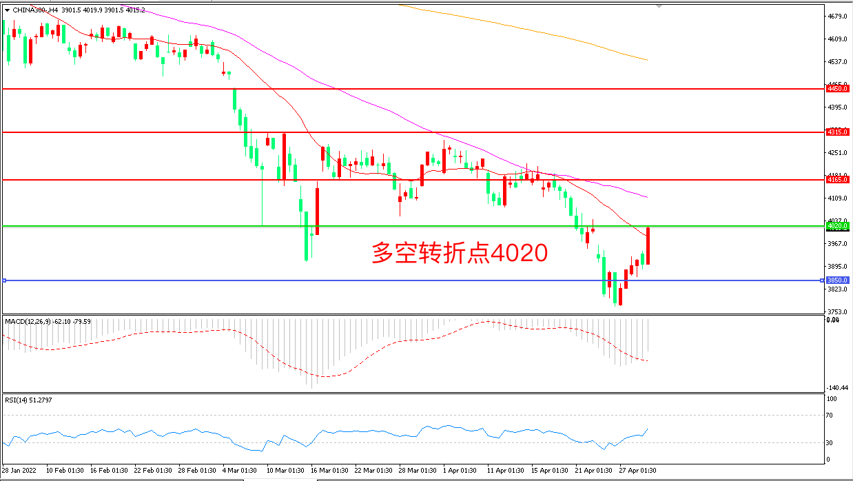 4小时图看,沪深300长阳拉升,短线走势偏强, MACD绿柱缩短,RSI指标向上,日内延续上行概率较大。