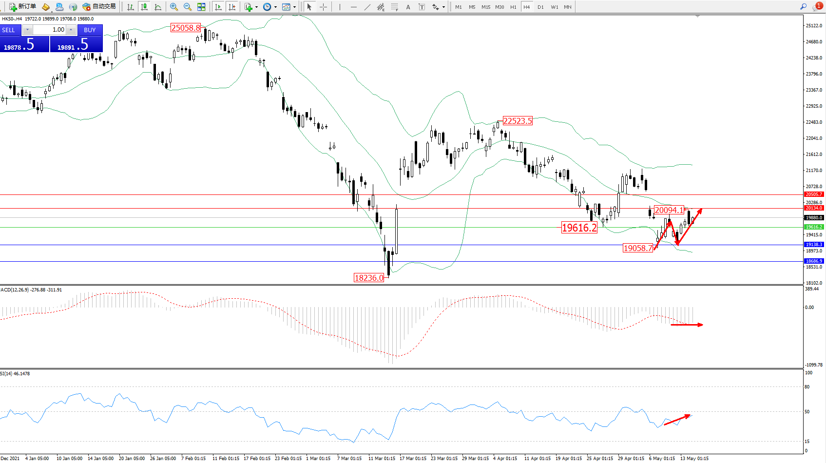 香港恒生指数5月16日(周一)收盘上涨51.44点,涨幅0.26%,报19950.21点;港股今日受美股止跌反弹叠加国内疫情好转大幅高开,4月社会消费品零售等数据走弱,致指数高开走低,午后回升收盘小幅上涨。恒生科技指数涨0.01%。盘面上,大型科技股走势分化,阿里巴巴、百度涨超2%,美团、腾讯分别跌2.45%和1.24%;港A两市海运股集体走高,中远海能近日公布,间接全资子公司香港船管与联合卖方签订船舶建造合同,约定由沪东中华造船(集团)有限公司为香港船管建造2艘17.4万方LNG运输船舶,2艘船舶总价约为4.3亿美元。
