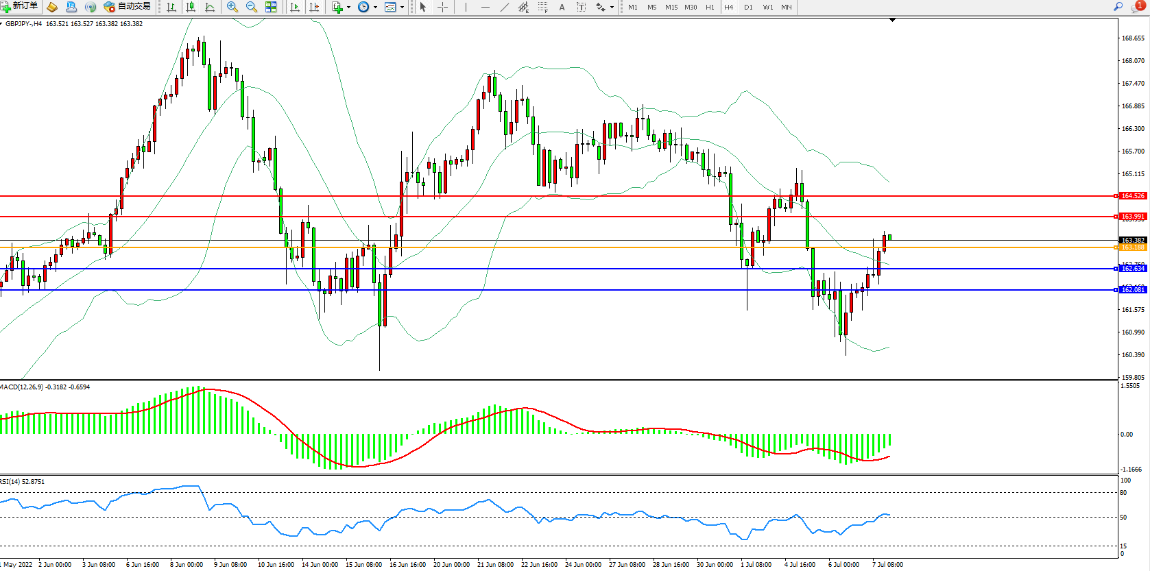 英镑兑日圆低位震荡上移至163.382附近震荡,英国5月份通货膨胀率达到9.1%,英国央行6月份更新的数据显示,10月份通货膨胀率将达到近11%的峰值。英国央行在6月份发布最新数据时表示,将进一步加息25个基点。