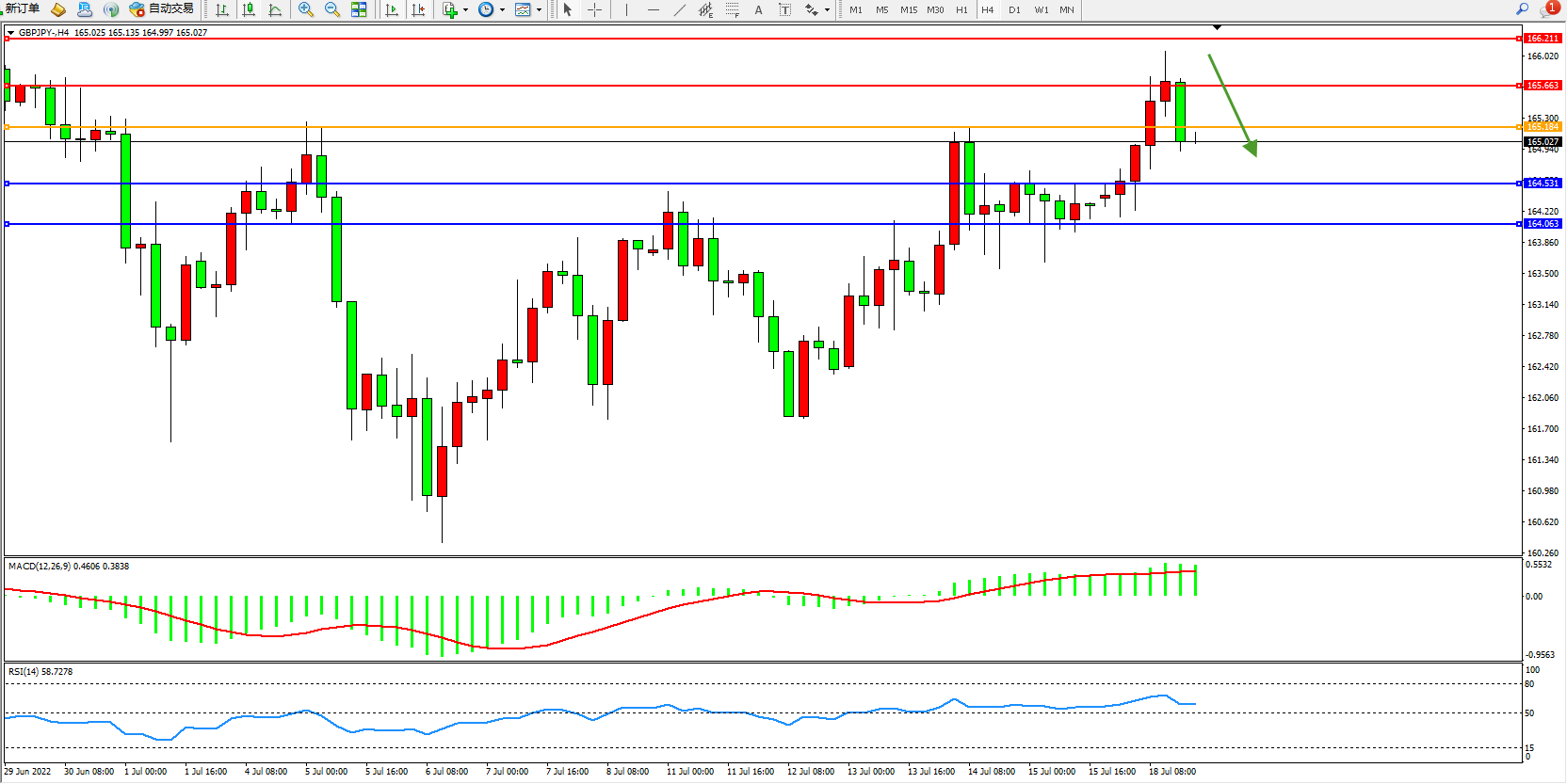 备选策略:165.184上方看涨,目标165.663、166.211