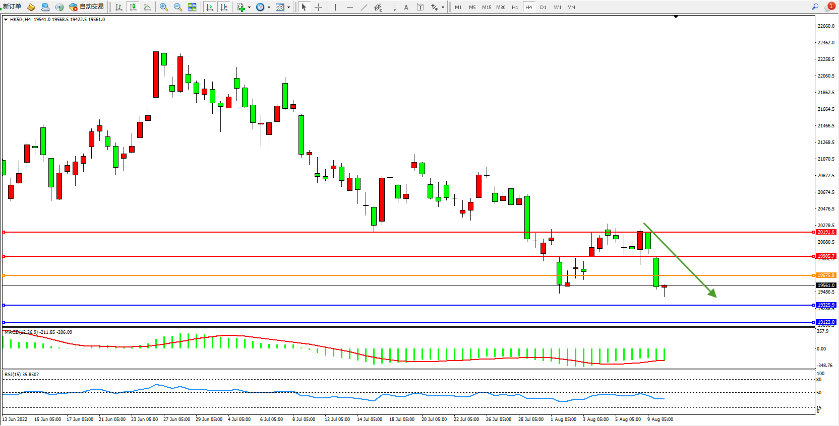 香港恒生指数8月10日(周三)收盘下跌392.6点,跌幅1.96%,报19610.84点;港股全天维持跌势,行业板块近乎全部下跌,市场情绪十分低迷。恒指跌1.96%再度下破2万点大关,且刷新阶段低价,恒生科技指数跌2.83%,跌破4200点。惠誉评级表示,香港决定放宽强制性检疫要求,将减轻入境旅客负担,但对抵消香港的短期增长和财政压力作用不大。惠誉评级同时预计今年香港经济将再萎缩,将香港今年经济增长预测,由此前预测增长1%,下调至负增长0.5%。