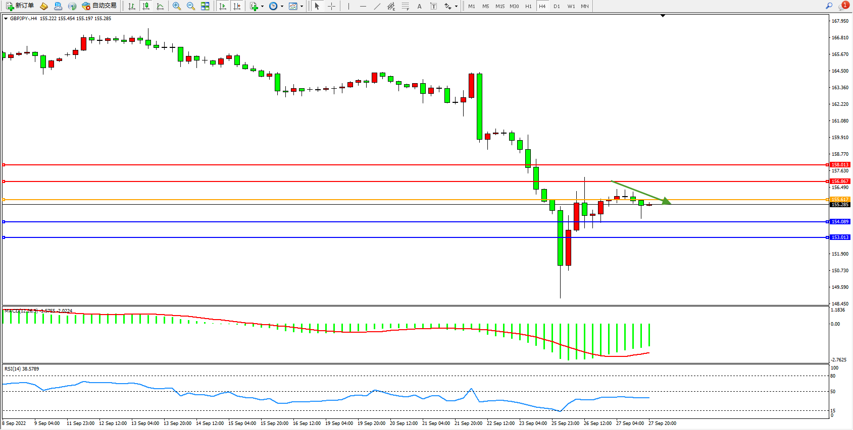 英镑日圆GBPJPY——4小时K线图显示: