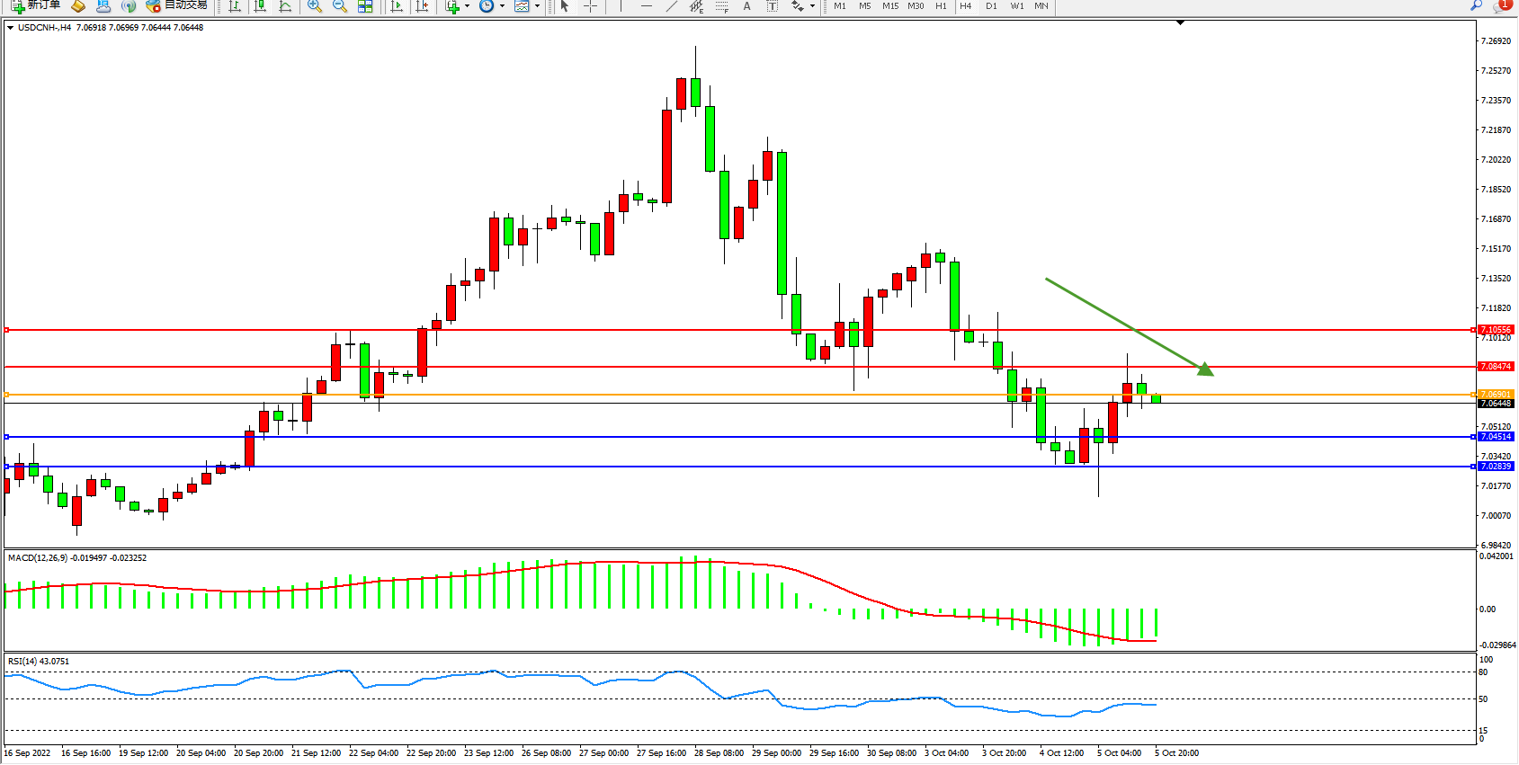 美元人民币USDCNH——4小时K线图显示: