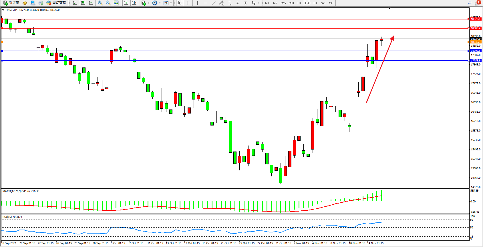 香港恒生指数11月15日(周二)收盘上涨723.41点,涨幅4.11%,报18343.12点;港股再现大级别上涨行情,三大指数近几日加速上涨,市场做多情绪一片向好。恒生科技指数涨幅最为亮眼,最终收涨7.3%收复3800点,恒指涨4.11%上扬超700点,国指涨4.84%重回6000点大关。大型科技股领衔大市走强,阿里巴巴涨11%,快手、腾讯涨超10%,南下资金全日净流入35.6亿港元,大市成交额放大至2050亿港元。