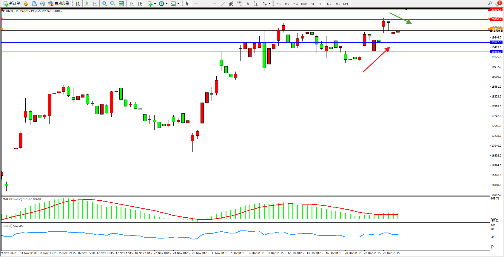 4小时图看:高位多头动力阶梯式震荡上扬,短期遇阻回撤,市场空头动力有伺机入场迹象,MACD指标处于多头区域整理,RSI指标处于50均衡线上側弱势徘徊;