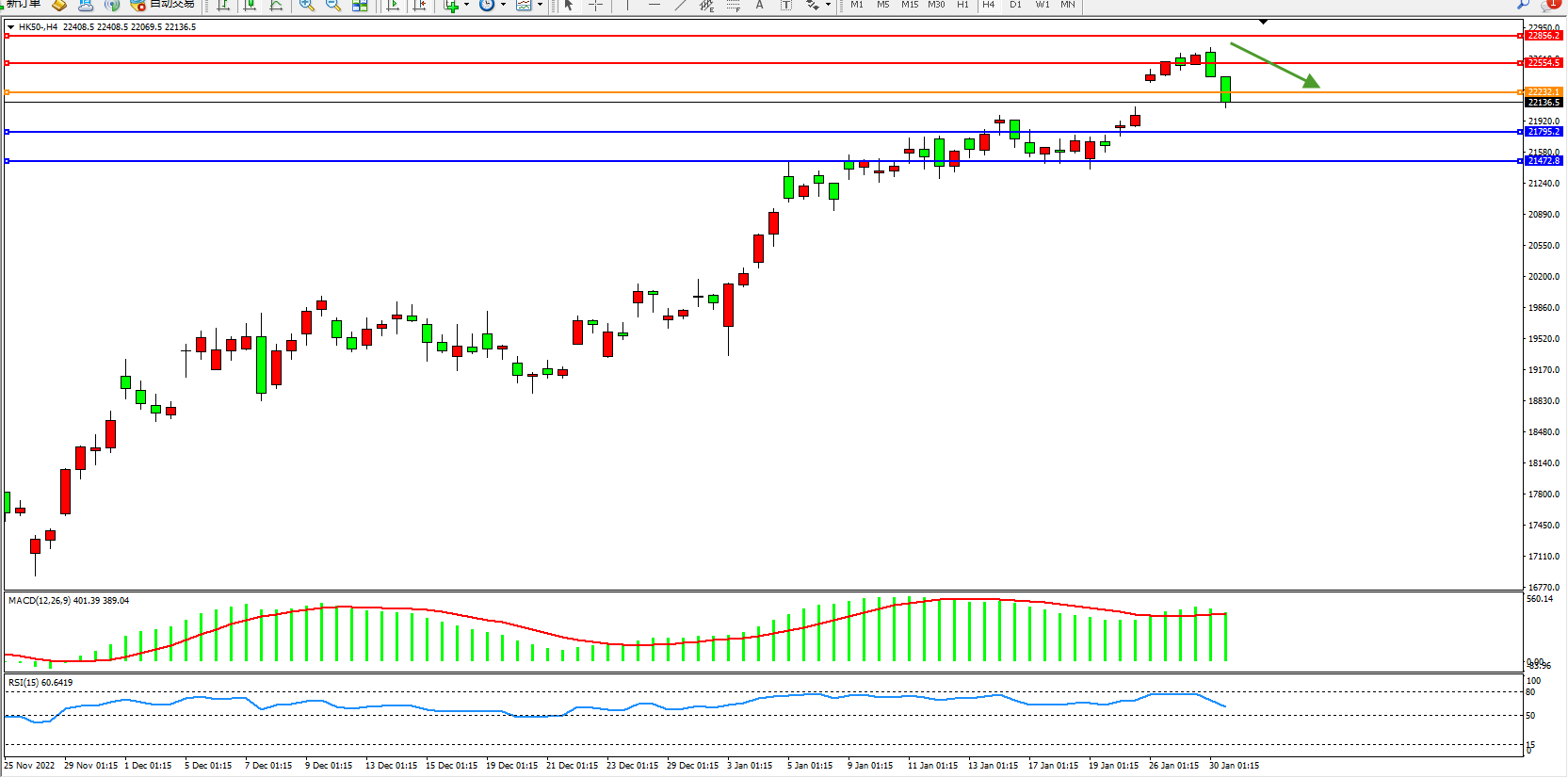 香港恒生指数1月30日(周一)收盘下跌619.17点,跌幅2.73%,报22069.73点;港股兔年上周迎来开门红,今日三大指数大肆回调,恒生科技指数大跌4.84%表现最差,恒指、国指分别跌2.73%和3.57%,恒指重挫超600点,三者均抹平上周2个交易日的涨幅。军工股全天维持强势,消息指香港未来几日或免核酸通关,香港本地股多数上涨,港铁公司、长和逆势涨近2%。南下资金净流出37.19亿港元,大市成交额放大至超2000亿港元。