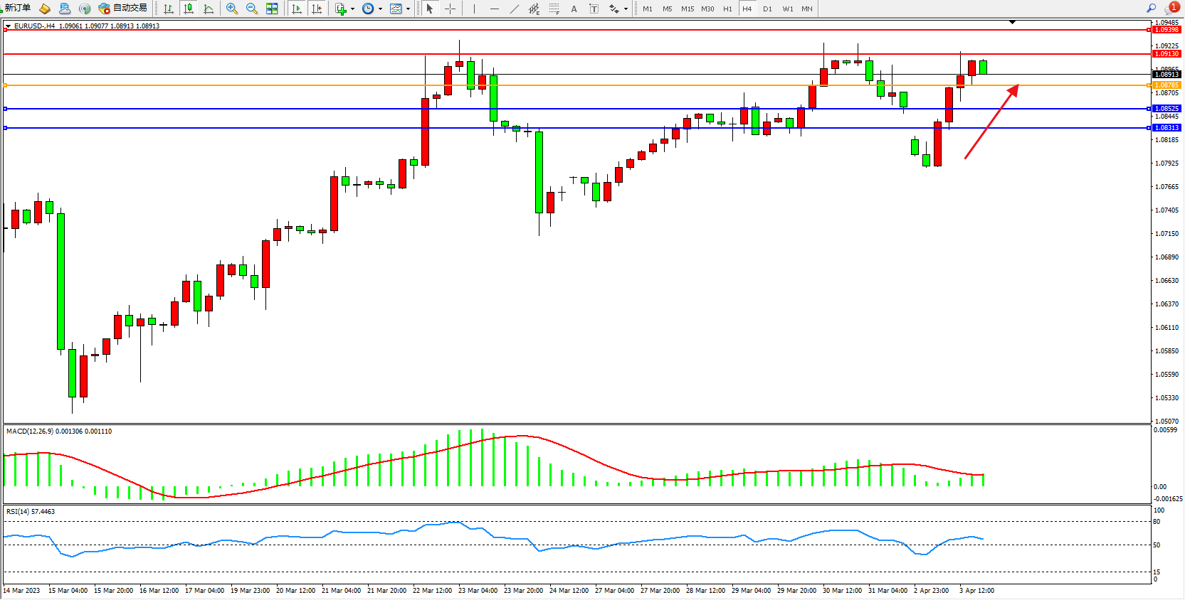 欧元美元EURUSD—4小时K线图显示: