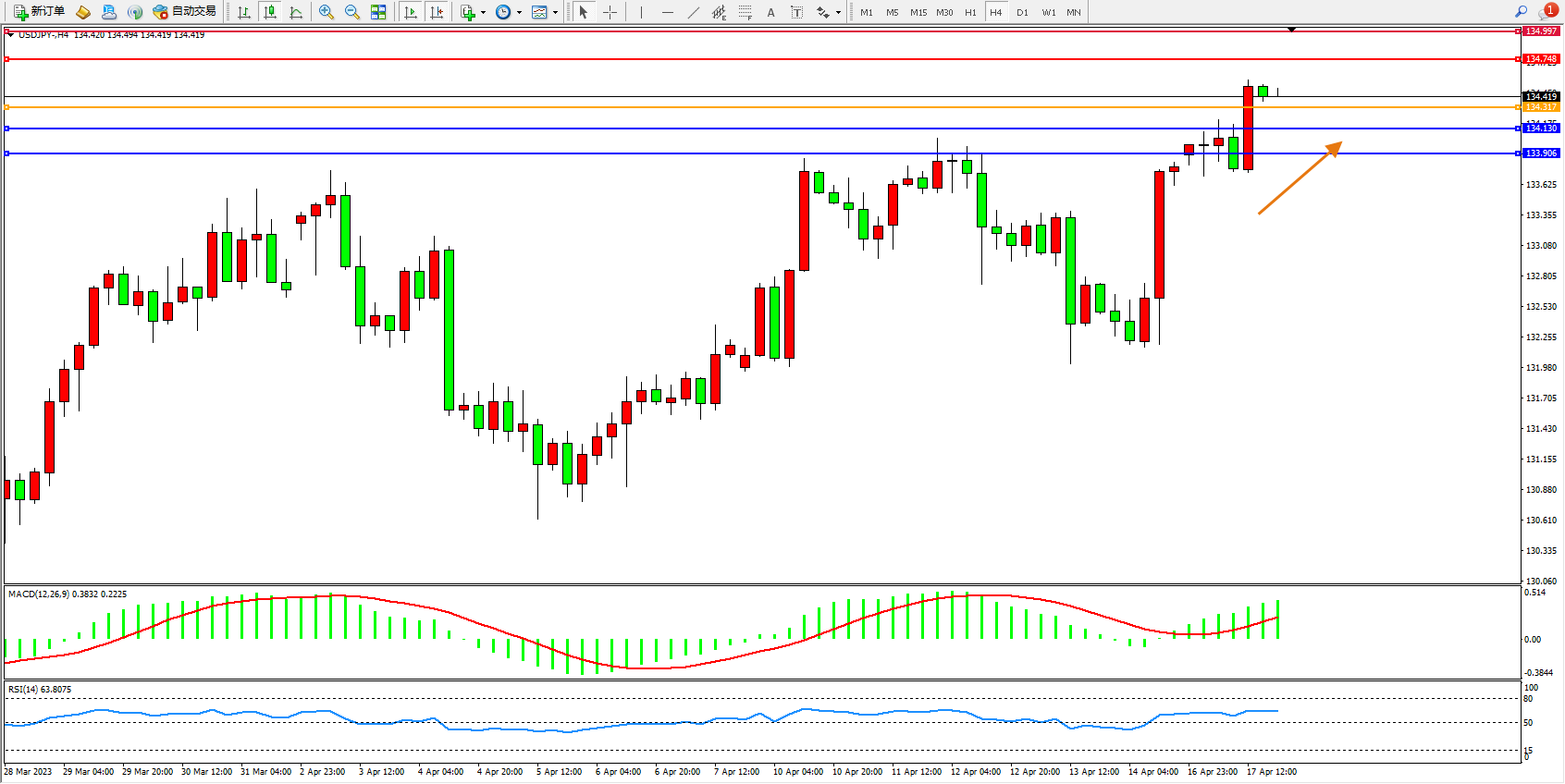 交易策略:134.317上方看涨,目标134.748  134.997