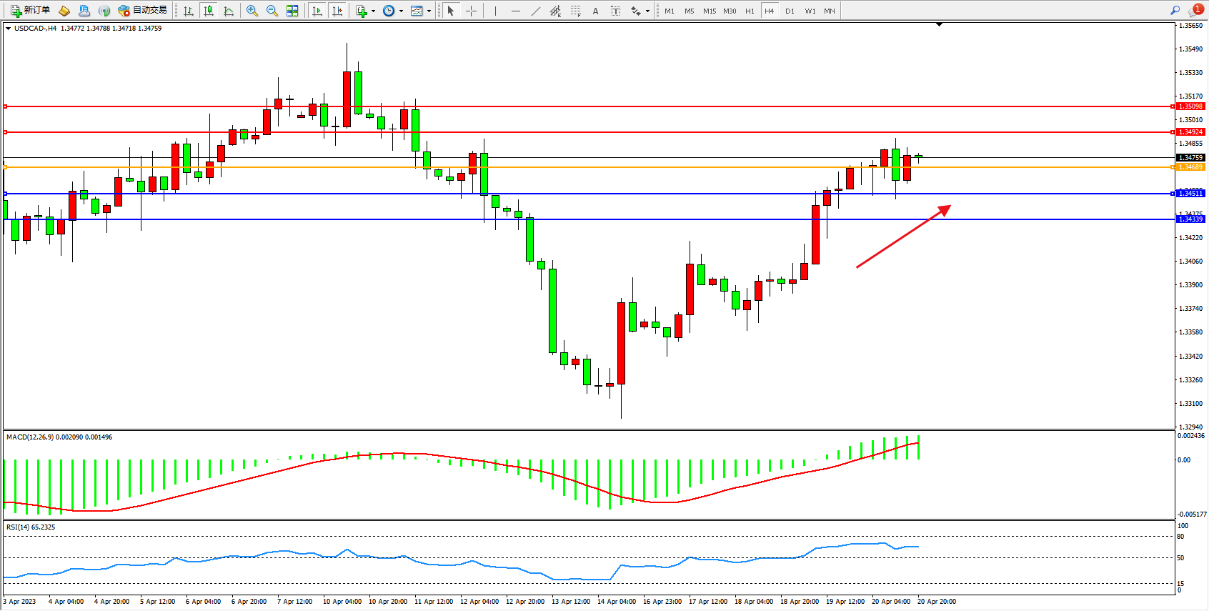 美元加元USDCAD——4小时K线图显示:
