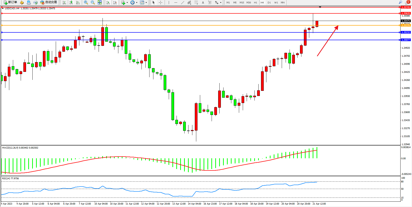 美元加元USDCAD——4小时K线图显示: