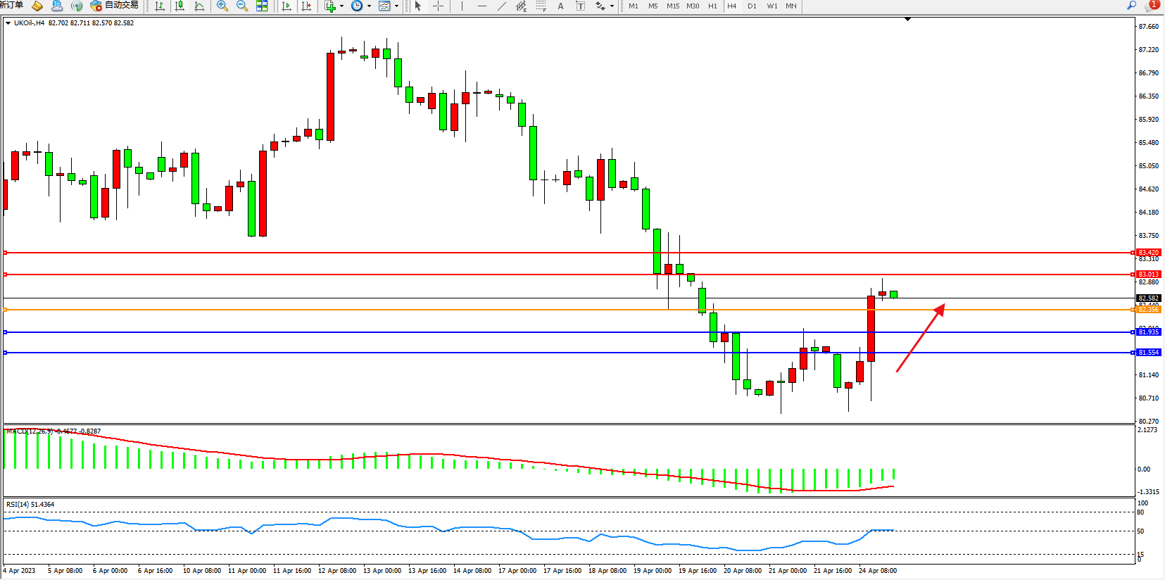 4小时图看:低位多头动力强势拉升上扬,短期看涨情绪涌现,市场多头不断攀升,MACD指标处于空头区域维持整理,RSI指标处于50均衡线附近弱势徘徊;