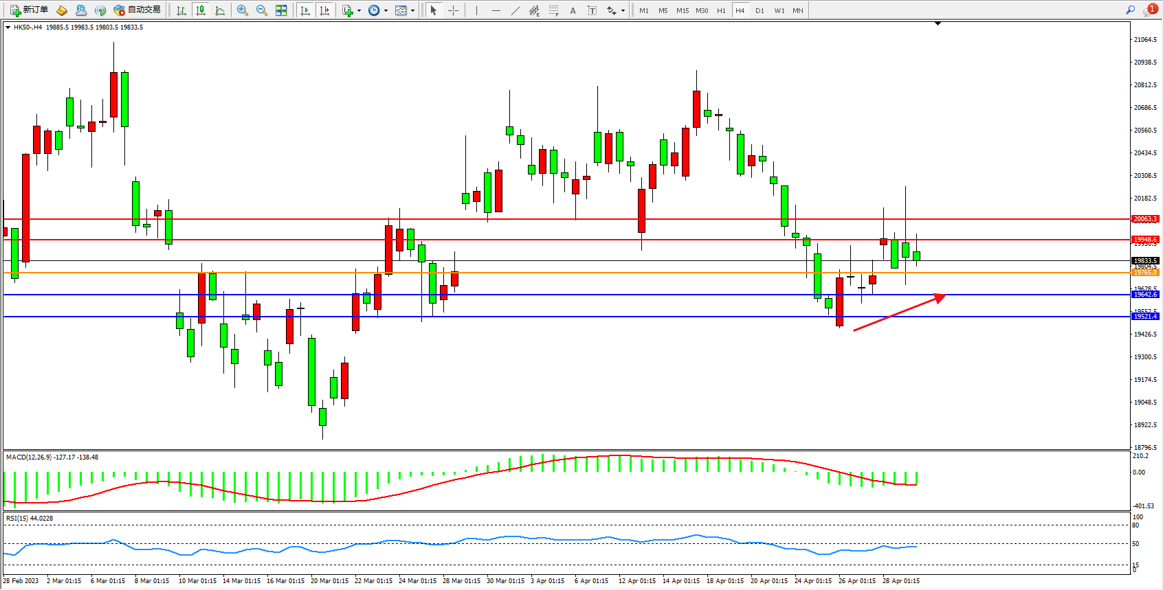 香港恒生指数5月2日(周二)收盘上涨39.24点,涨幅0.2%,报19933.81点;5月首个港股交易日,三大指数早盘冲高回落后小幅反弹,午后持续在涨跌一线横盘徘徊,截至收盘,恒指小幅收涨0.2%,国指跌0.33%,恒生科技指数跌0.08%。受“五一”假期火爆出游消息刺激,公路与铁路板块全天强势,香港经济摆脱连续4个季度的跌势。政府统计处公布预先估计数字,今年第一季GDP同比上升2.7%,主要是由于内部需求明显增加;去年第四季则跌4.1%。经季节性调整后按季比较,GDP升5.3%(预期3.00%)。