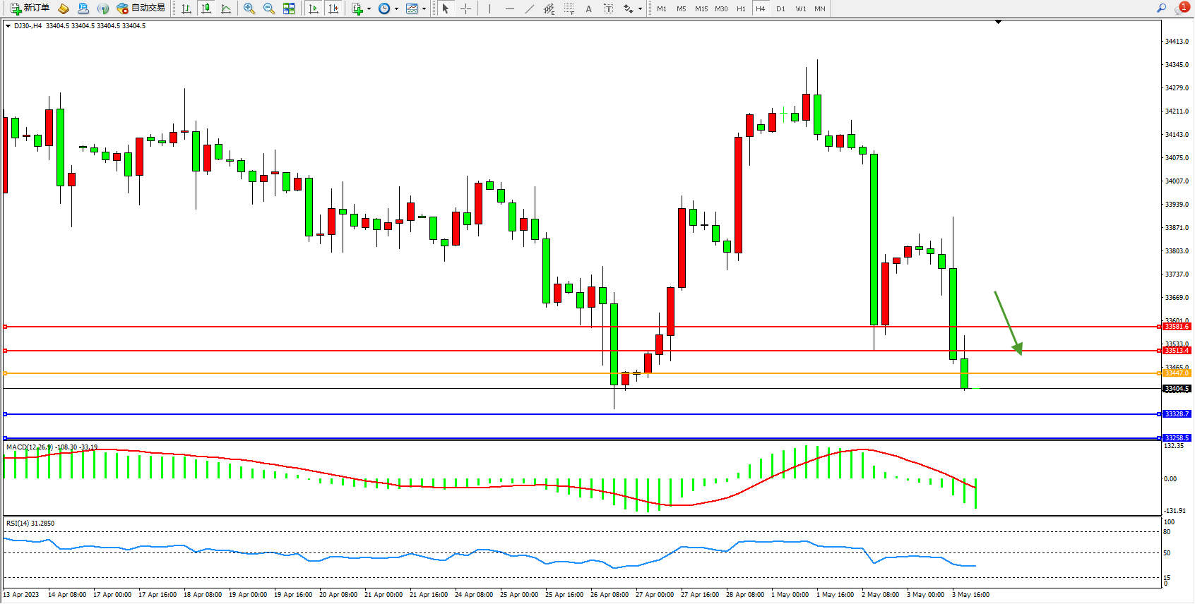道琼斯指数53日(周三)收盘下跌270.42点,跌幅0.80%,报33414.11点;美联储公布最新的5月利率决议,美联储加息25基点,至5.00-5.25%。美联储本次决议措辞较为中性,市场认为美联储接下来将暂停本轮加息。目前市场焦点转向稍后的美联储主席鲍威尔的讲话。