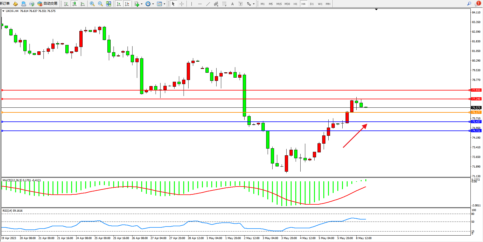 布油维持76.575附近震荡,由于担心美国银行业危机将减缓全球最大石油消费国的经济并削弱燃料需求,上周布伦特原油价格下跌5.3%,健康的美国4月份就业报告、美元走软以及石油输出国组织和盟友(OPEC+)在6月份召开下次会议上削减供应的预期,帮助两大市场在上周五反弹了约4%。
