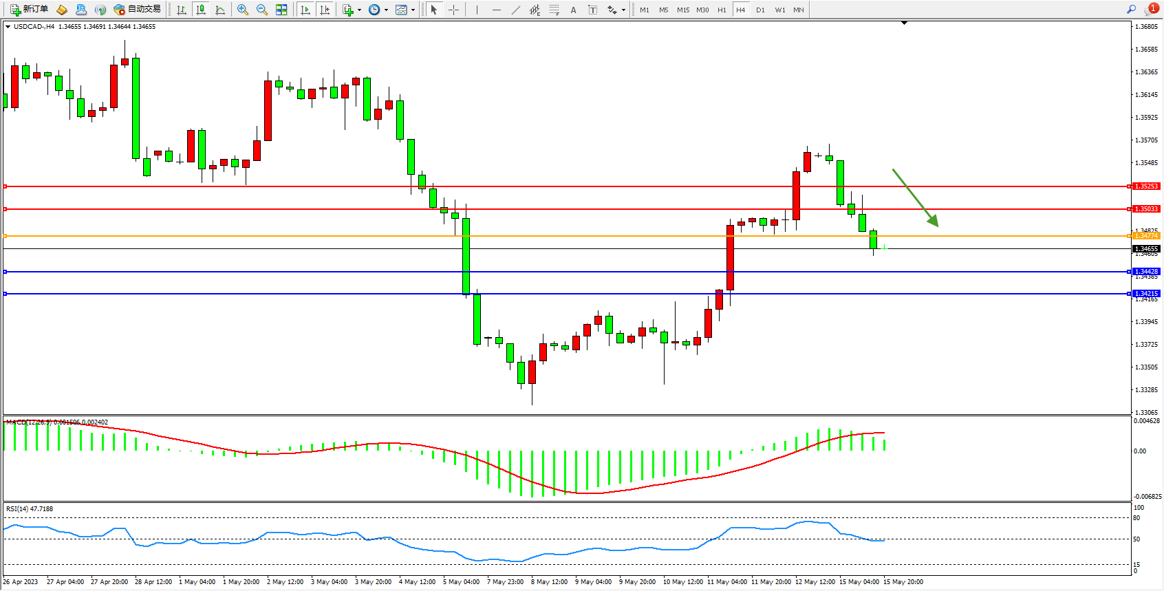 美元加元USDCAD——4小时K线图显示: