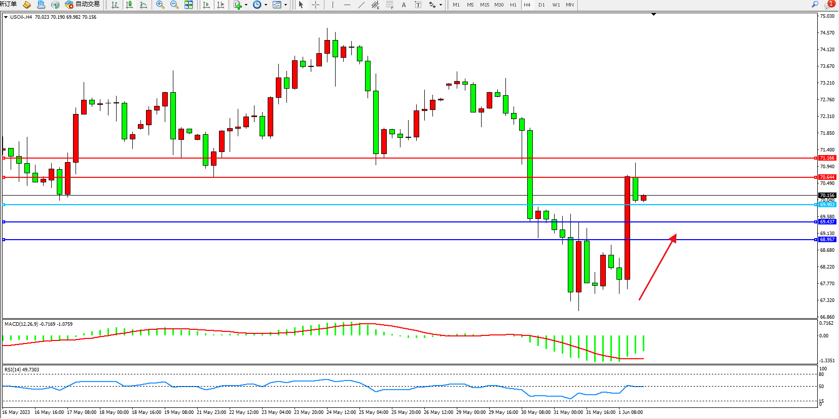 原油维持70.156附近震荡,美国至5月26日当周EIA原油库存 448.8万桶,预期-138.6万桶,前值-1245.6万桶。美国至5月26日当周EIA俄克拉荷马州库欣原油库存 162.8万桶,前值176.2万桶。