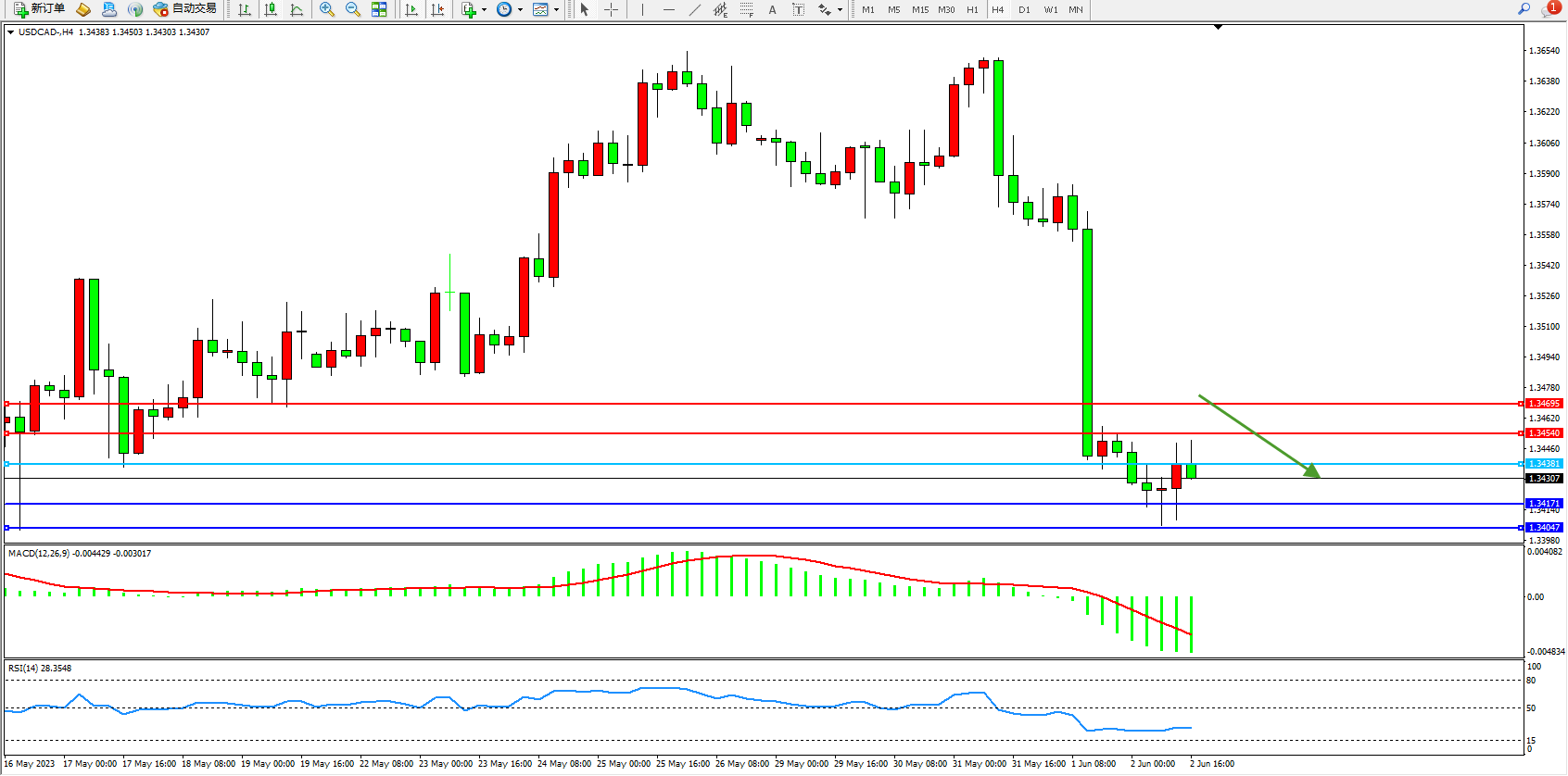 美元加元USDCAD——4小时K线图显示: