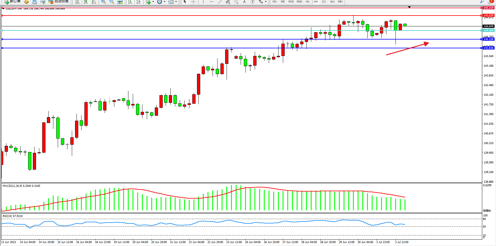 交易策略:144.489上方看涨,目标145.039  145.319