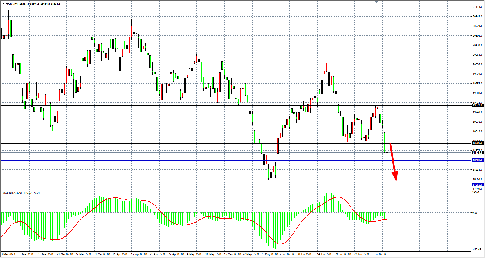 4小时图看,恒指进一步回落跌破18700,MACD量能零轴下放量,趋势走空头,阻力下移至18700附近,该位下继续看跌18200-17960。