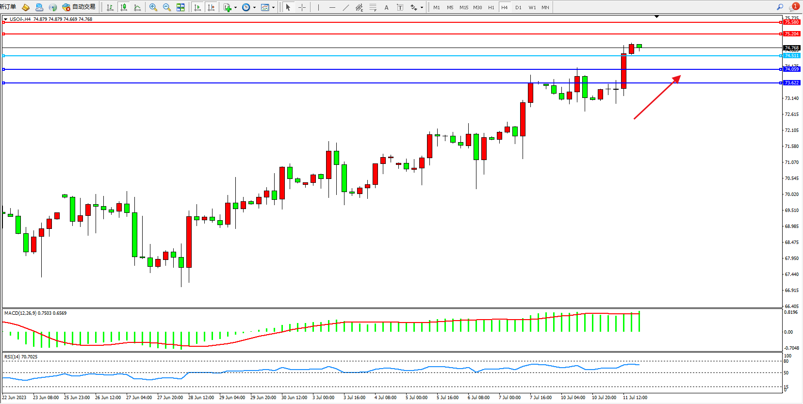 交易策略:74.811上方看涨,目标75.204  75.580