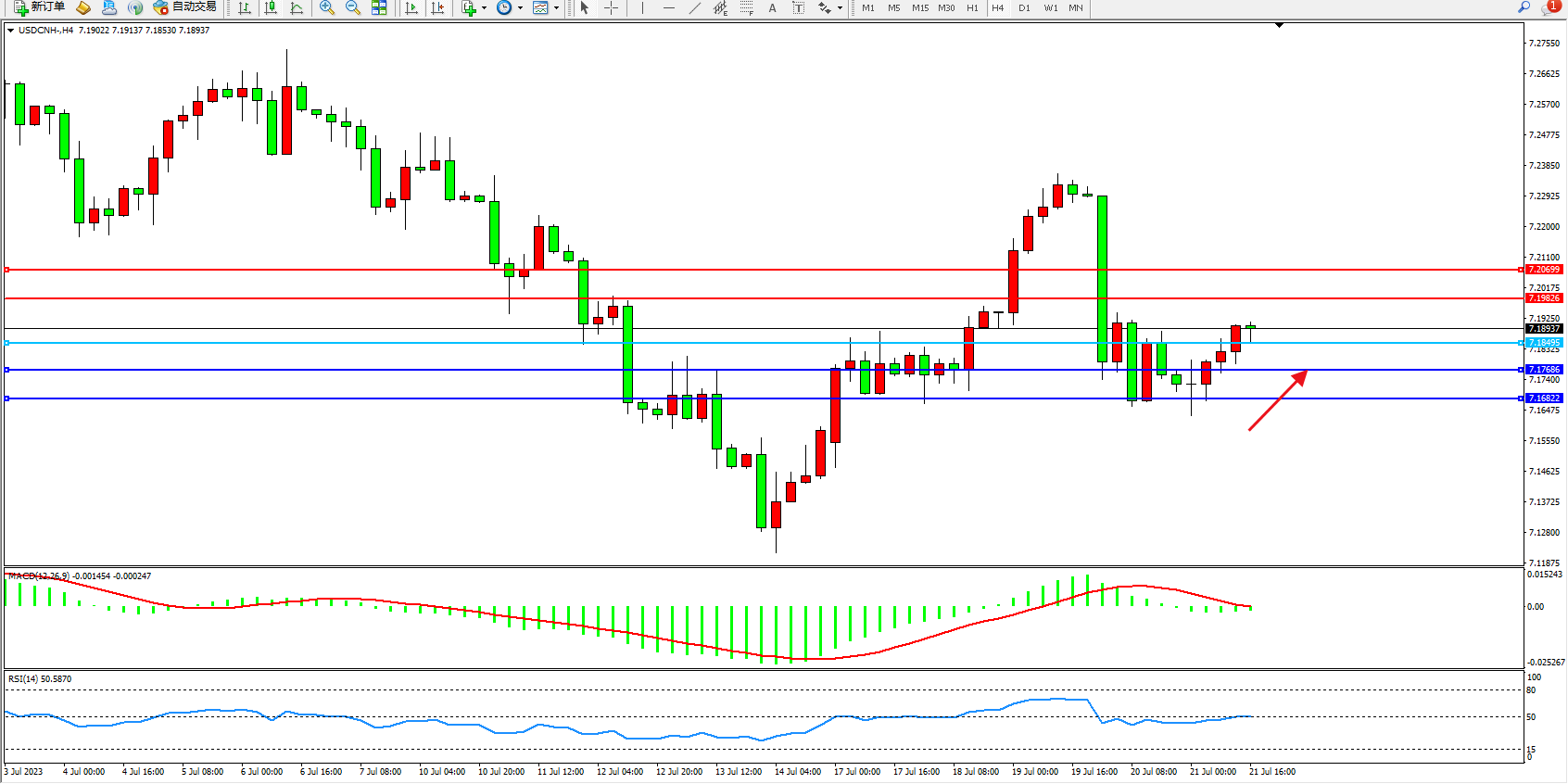 美元人民币USDCNH——4小时K线图显示: