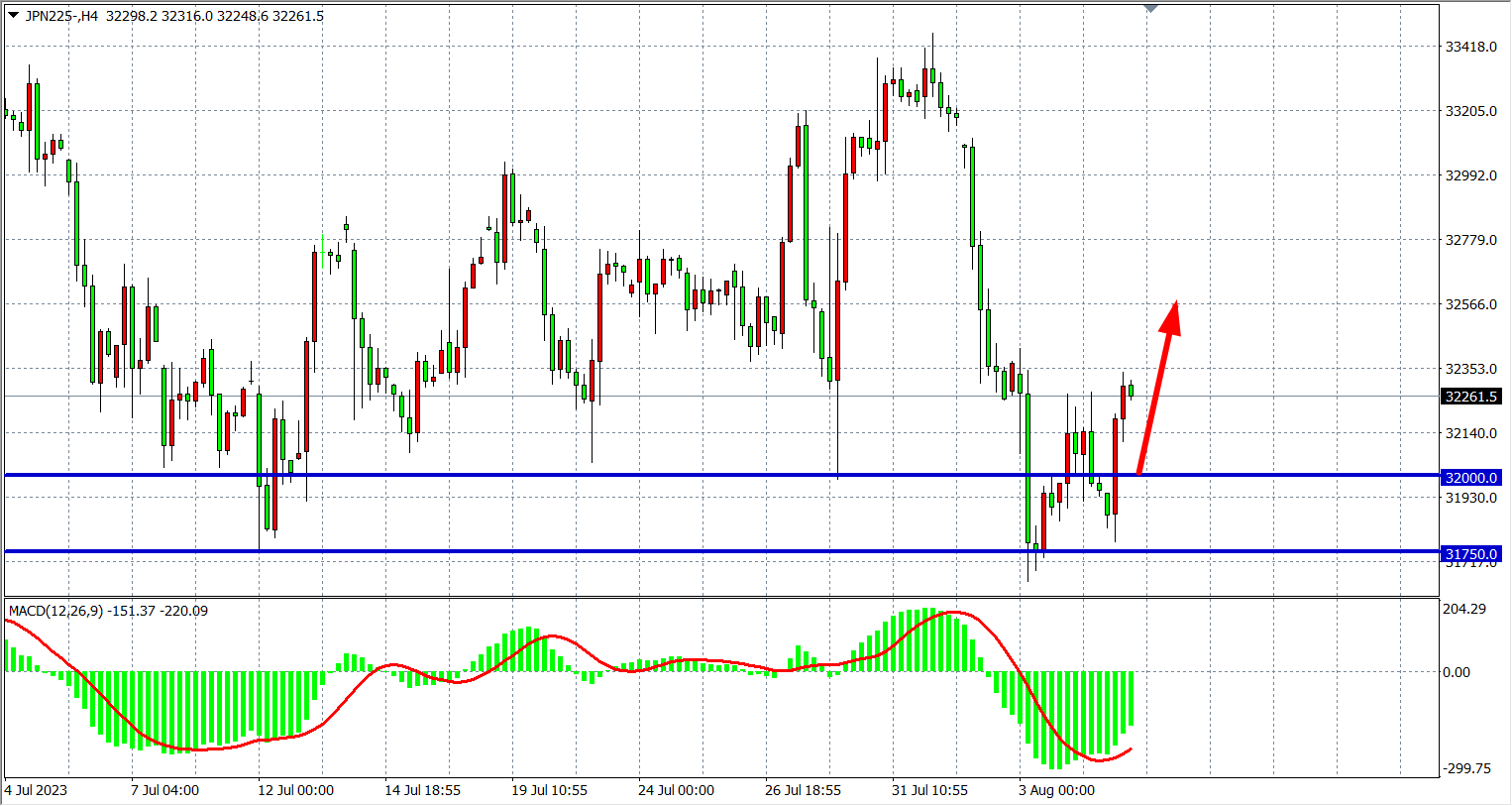 4小时图看,日经指数在前低点31750附近再度获支撑反弹,MACD量能在零轴下有所缩量,反弹行情或有望延续,支撑上移至32000一线,该位上继续看反弹32300-32700。