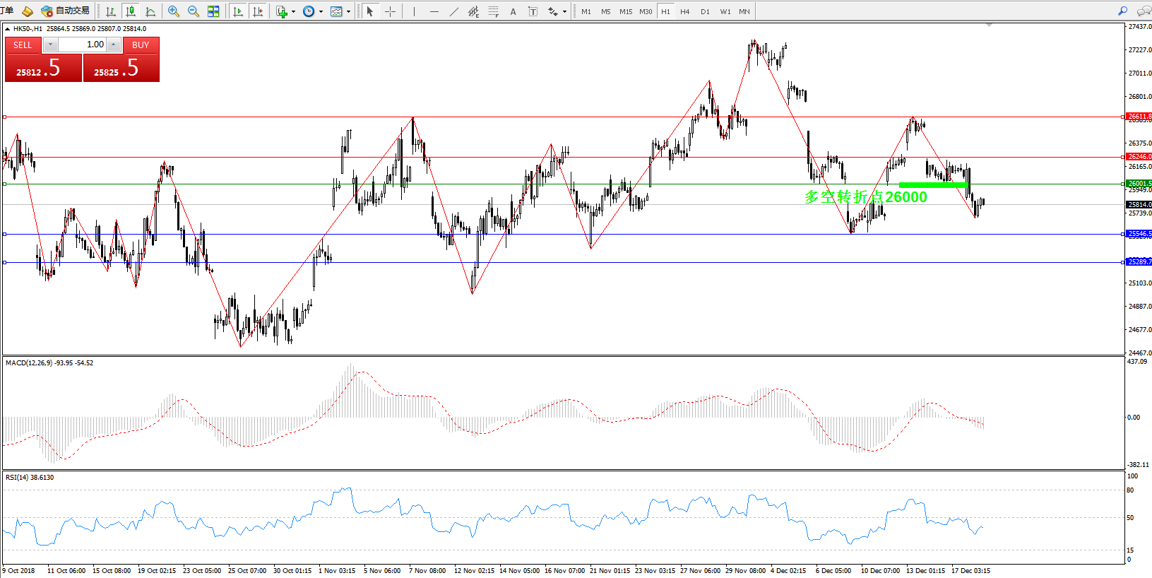 港股市场弱势下跌,恒指再次跌破26000点。截至收盘,恒指跌1.05%,报25814.25点;内房股、军工股、互联网+跌幅居前,石油股、建材水泥、汽车股、煤炭、航空股等普遍下跌。