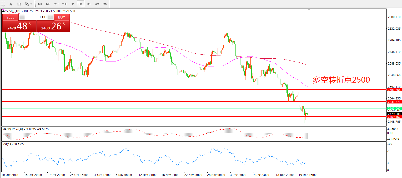 4小时图看,标普500跌破2530 支撑后持续下行,均线系统呈空头排列之下, MACD绿柱增加,RSI掉头向下,短期回落风险依然较大。