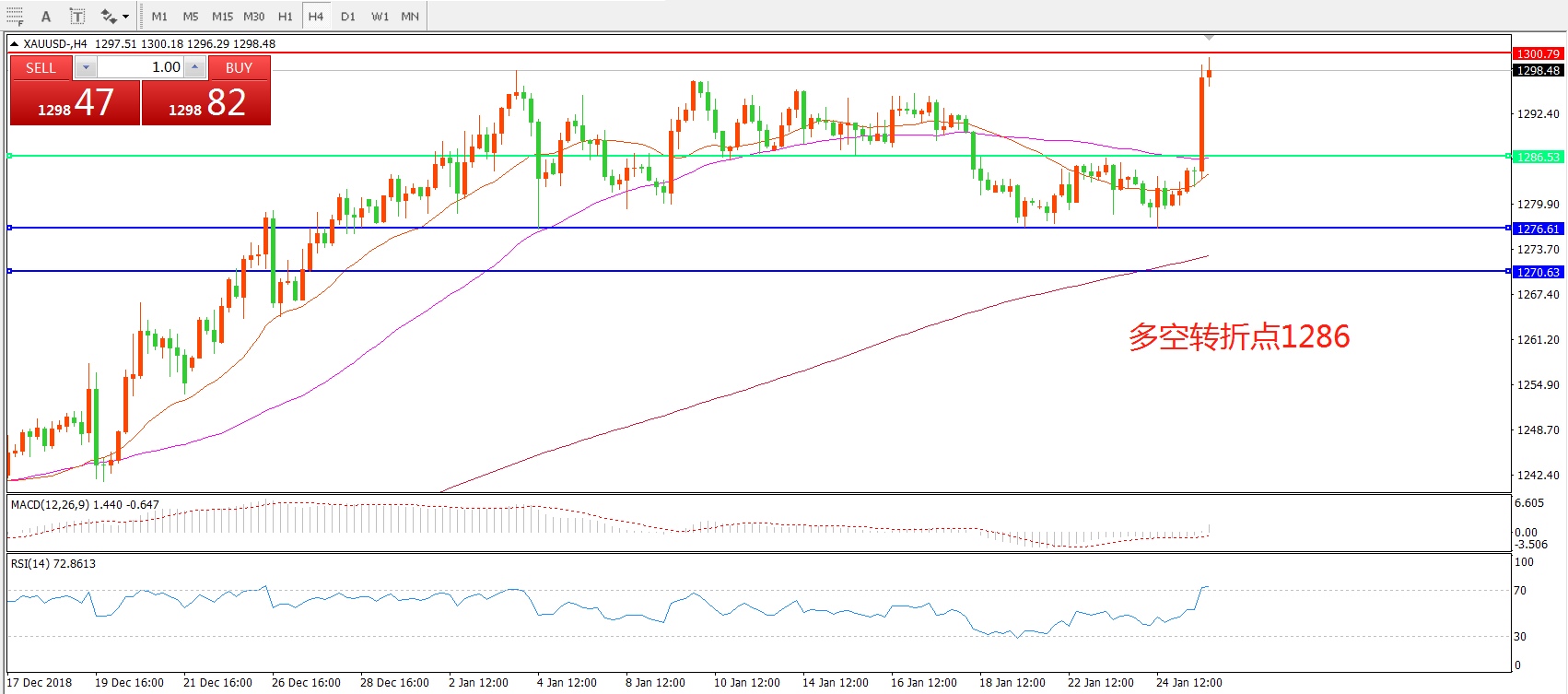 4小时图看,黄金在1280附近盘整后逐渐站稳,周五在消息面的提振下突破55均线1286,强势逼近1300阻力。亚盘时段预计价位有所回落,但整体走势偏多无疑。