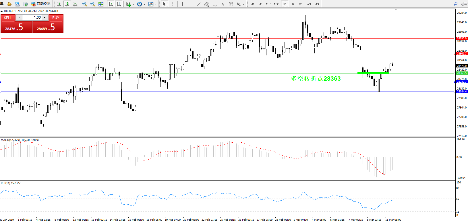 恒指HK50 ——1小时K线图显示: