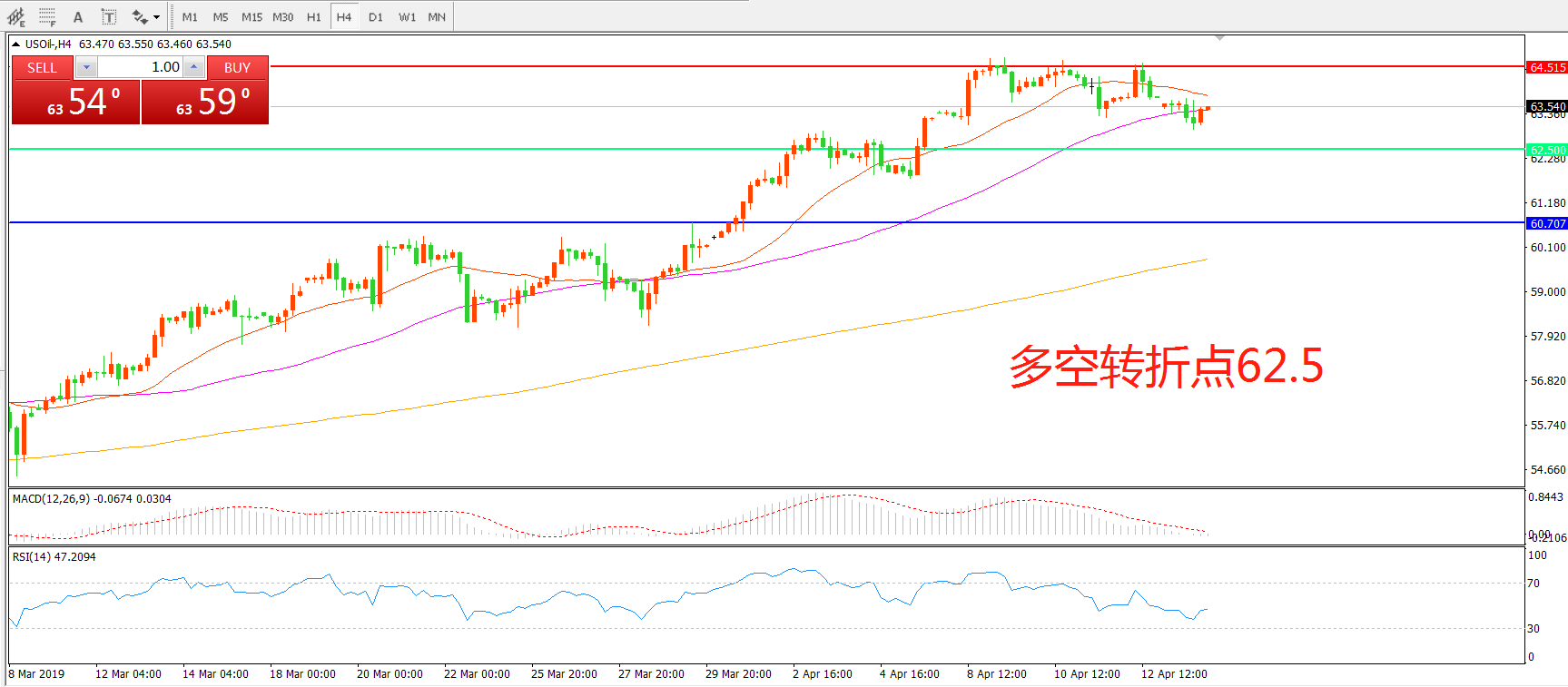 4小时图看,油价触碰上方64.5阻力后震荡下行,调整迹象明显,21均线拐头有下穿形成死叉迹象,MACD红柱减少,RSI指标向上,日内有回落可能,重点关注62.5一线支撑。