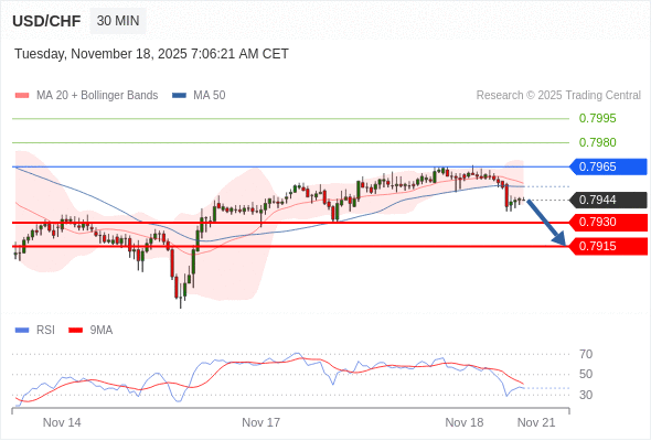 在 0.7965 之下,看跌,目标价位为 0.7930 ,然后为 0.7915 。