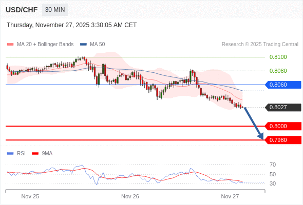 在 0.8060 之下,看跌,目标价位为 0.8000 ,然后为 0.7980 。