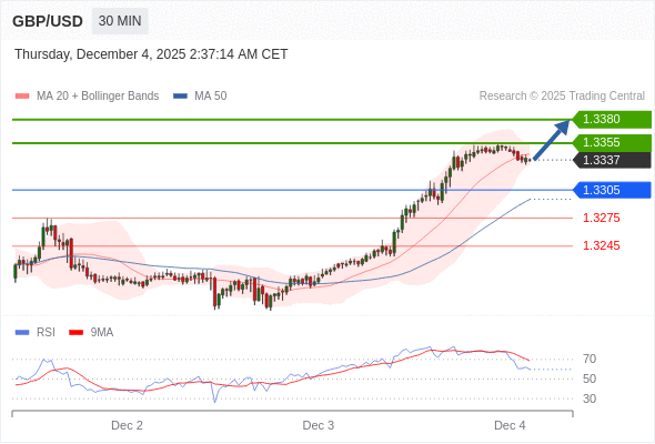 在 1.3305 之上,看涨,目标价位为 1.3355 ,然后为 1.3380 。