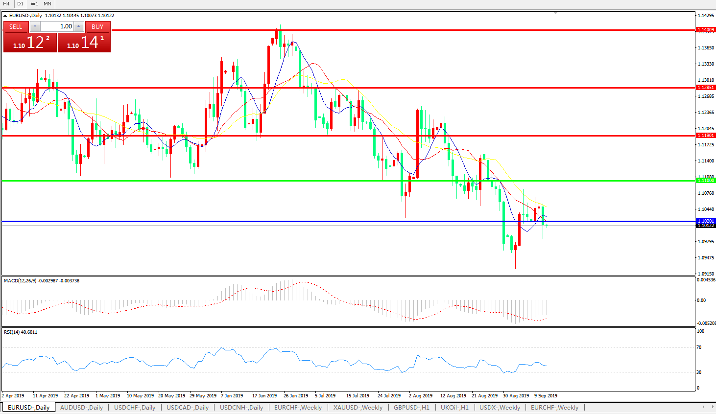 技术面简析:日图均线总体呈下行态势,汇价昨日骤跌逼近1.10关口附近,MACD运行于0轴下方且量能基本维持,RSI有缓步走弱态势,预计汇价大概率将进一步下行。
