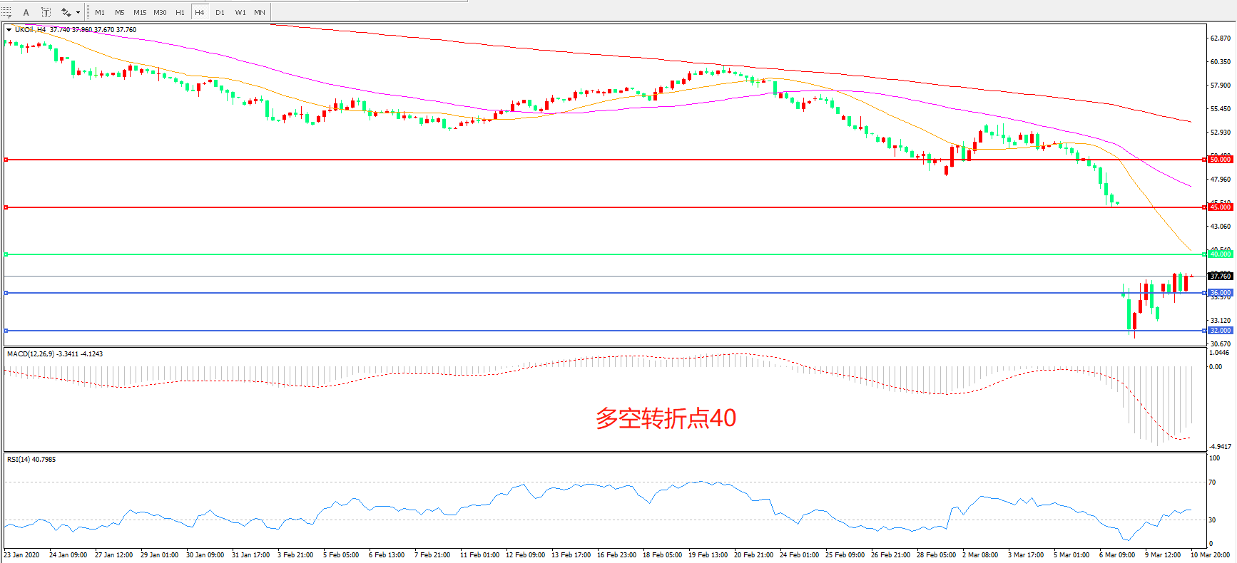 4小时图看,美油大幅低开后震荡回升,短线有止跌迹象,如能突破36美元一线,有望回补缺口,均线系统呈空头排列,MACD绿柱减少,RSI指标走平,日内延续震荡概率较大,中期走势仍然偏空。