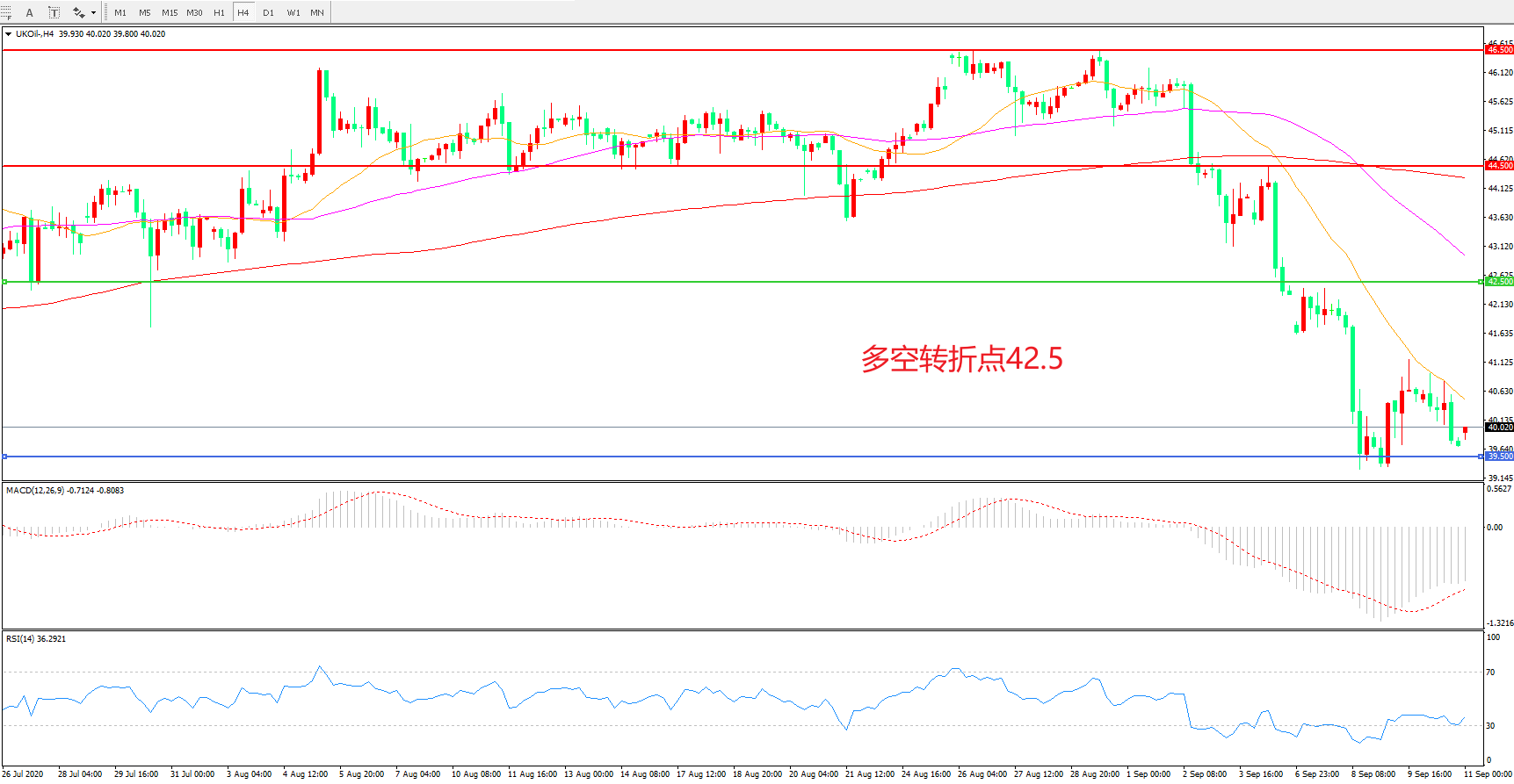 4小时图看,油价冲高回落,整体走势偏弱,21周期均线成为短期阻力,39.5美元成为短期支撑,MACD绿柱缩短,RSI指标走平,日内延续震荡概率较大。