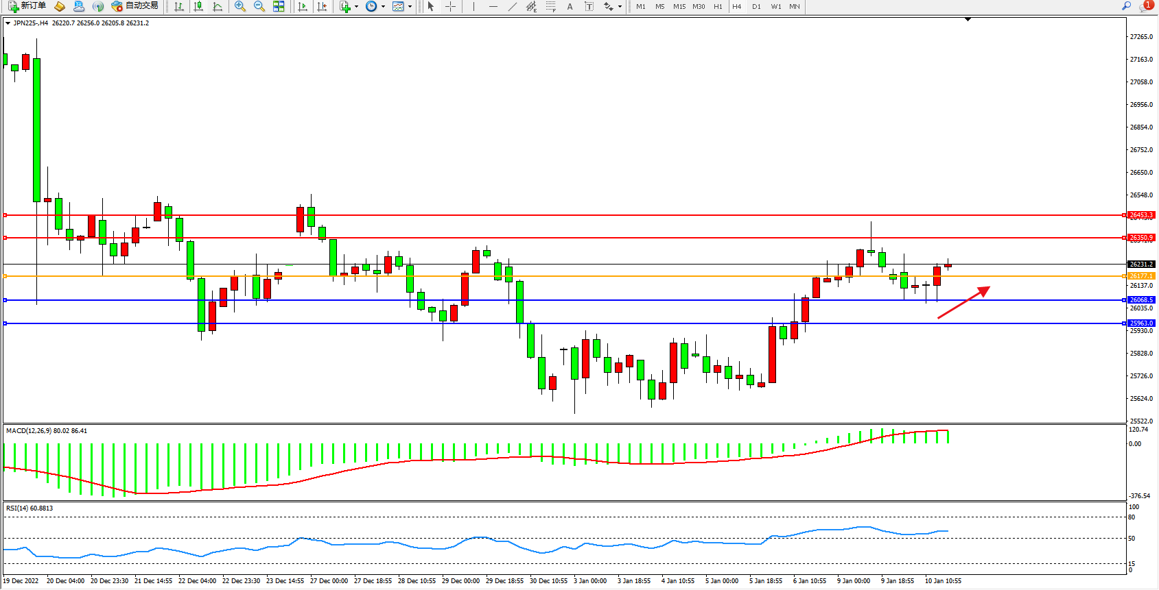 日经指数JPN225——4小时K线图显示: